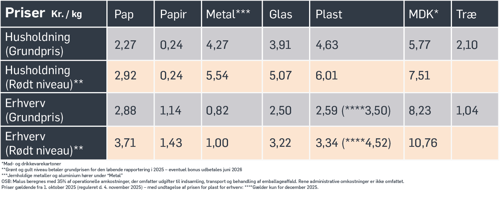 3. Miljøniveau – grønt/gult niveau eller rødt niveau. Rødt niveau betyder, at emballagen vurderes mindre genanvendelig og derfor bliver dyrere at bringe i omløb.